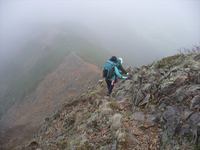 山頂からの下りは気が抜けない痩せ尾根。
