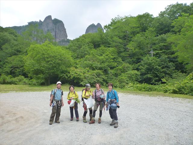 20高岩を背にオギノヤの駐車場で、まだ林道登山口まで少々残る