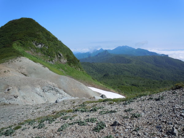 植物群を育む蛇紋岩の砂礫の向こうには芦別岳が・・・。