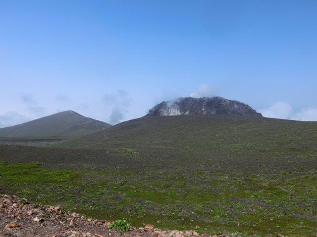 噴煙を上げるドームと左に西山