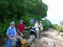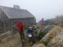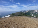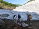 | 《7月30日(水)》 今日も快晴。北海岳~白雲岳にむかって皆さん絶好調で出発。心配してた2か所の徒渉も増水してなく無事通過。 ところどころ残る雪渓も難なく通過し、チングルマ、エゾコザクラを楽しみ、雄大な黒岳・凌雲岳・北鎮岳を俯瞰しながら 8:00に北海岳に到着。頂上からは御鉢平の雄大な渓谷と、雲ノ平の稜線がとてもすばらしい。 頂上からは広くなだらかな尾根を下り五色岳、赤岳を眺めながら、咲き誇る高山植物群の道を白雲岳に向かって 少しピッチを上げて進み、10:15に白雲岳に到着。大きな岩がゴロゴロしてる頂上は想像以上に雄大な眺め。 トムラウシもきれいに見えた。あそこまで行くんですと言う登山者も何人かいて大雪山系に来たんだな~と、みなさん 感激の頂上でした。ピストンで黒岳石室小屋に戻り宴会宿泊。 小屋に戻ってから桂月岳にピストン登山の計画でしたが、すぐに宴会に突入して中止。まあいいか! 日本酒が売り切れで残念。ないと余計にほしくなりますね。小屋の入りは3分ぐらいでした。 |