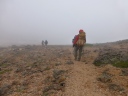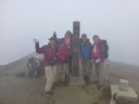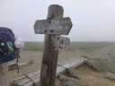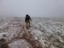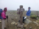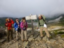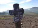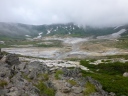 | 《7月31日(木)》 今日は下山後の旭川市内での打上げ宴会の時間配分を考えて、4:50に朝食抜きで出発。 1時間ほどは好天に恵まれ、雲ノ平の稜線とキバナシャクナゲ・アオノツガザクラ・チングルマを眺めながら元気よく 歩き始める。だんだん風が強くなってきた。2020m付近のハイマツの下で朝食を取り、御鉢平展望所に来るとガス と強風で立っていられないくらいだ。 6:10に北鎮分岐下の雪渓に到着。小屋の情報ではアイゼンは不要と言われたが、早朝で雪が一部分アイスバーン 状態。ガスと強風のなか急な雪渓を何とか乗り切ったが、メンバー全員の体力・技量に差があるなかで、私自身 リーダーとして装着すべきだったのでは・・と今では反省してます。(後続のパーティーは装着してた) ガスと強風のため北鎮岳ピストンは断念し、旭岳に向かって足早に進むが何も見えない。小雨交じりのガスと強風で 体調不良の心配がでてきた。最後の難所ー旭岳直下の雪渓に8;50に到着。 こちらは雪が腐ってたので難なく登れたが、その後が超難所でした。それは蟻地獄の急登。 3歩進んで2歩ずり落ちる ーいやいやきつかったですね。 9:40感激の旭岳頂上に到着。何も見えないが大勢の登山者が。さすが100名山。すぐに下山にかかり、RW姿見 駅に12:00着。下山後食事をして旭川駅に15:40着。ホテルで入浴後、お土産を買いに市内へ。 女性のなが~い買い物に付き合うのは大変だ!くたびれるね!忍耐がいりますね!。 そのあと居酒屋-お魚センターで打上げ宴会。いや~美味しかったですね。今日はこの宴会の時間を目標に、全員 悪天候の中、北の山中を歩き続けました。 |