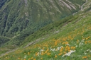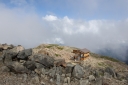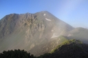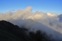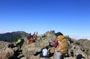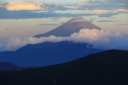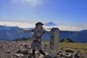 | 【コメント】 南アルプスアクセスパックというジャンボタクシーを利用して椹島に入りました。 この山域は入山までに時間がかかり、畑薙ダムの臨時駐車場までしか車は入れません。 決められた山小屋に泊まることが椹島への連絡バスに乗る条件です。 親子ほども年の離れた仲間との山行は責任を感じる部分もありましたが,それ以上に 楽しみでした。 台風10号と11号の合間の晴天にめぐまれ、富士山がいつもそばについてきてくれました。 途中で、山溪の記者に声を掛けられインタビューを受けましたが、親子だと思われての 声掛けだったようでした。 山行初日の千枚小屋まではほぼ樹林帯の中、一時、レインコートを着るほどではない雨に 遇いましたが、それも長い時間ではありませんでした。 南アルプス固有のタカネビランジも見つけました。 千枚小屋について分かったことですが、山の上は風雨とも強く、稜線を歩いてきた人たちは ストーブでレインコートを干していました。 千枚小屋の前庭からは富士山がきれいに見えるのですが、到着時は曇りで残念に 思いました。 一休みして前庭に出てみると、まさに赤富士!が日の入りまでずっと姿を見せてくれました。 二日目は、この山行のハイライト! 朝食は4時20分、日の出と富士山を堪能し、5時には出発しました。 千枚岳、荒川三山の悪沢岳、中岳、前岳と3,000m超の稜線を楽しみ、お楽しみの お花畑でゆっくり30分、今年は雪が多く、クロユリ、ハクサンイチゲ、シナノキンバイなど いつもより遅い開花に大喜びしました。ライチョウの親子にも出会えました。 荒川小屋の手前で、北岳から歩いてきたという単独行のIさんに声を掛けられ、赤石避難 小屋の情報をお教えしたことで、避難小屋まで同道、同宿することになりました。 トラバース道から大聖寺平は平坦な歩きやすい道ですが、小赤石岳までの登りは疲れも たまって踏ん張りどころです。 単独行のIさんがペースを作ってくれ、Yさんもがんばって歩いてくれたお陰で、 ほぼ予定通りの時間に、小赤石岳、赤石岳、赤石避難小屋へと歩を進めることが 出来ました。 三日目は、朝、避難小屋のご主人の予言通りの大きなブロッケンを見ました。 赤石岳に登り返す途中には、影赤石にブロッケンを再び見ることが出来ました。 単独行のIさんは、このまま光岳まで行くとのこと、私が3回に分けて歩いた道を 一度で走破しようとしていることに驚きました。 避難小屋のご主人の的確なアドバイスをもらって、気をつけながらゆっくりと下山しました。 若い仲間のがんばりに目を細めながら、母親気分での楽しい山行になりました。 (K.W 記) |