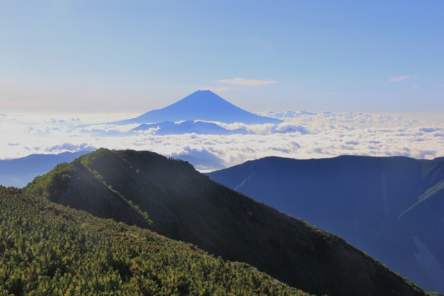 千枚岳から丸山へ 富士山と雲海、そして歩いてきた尾根