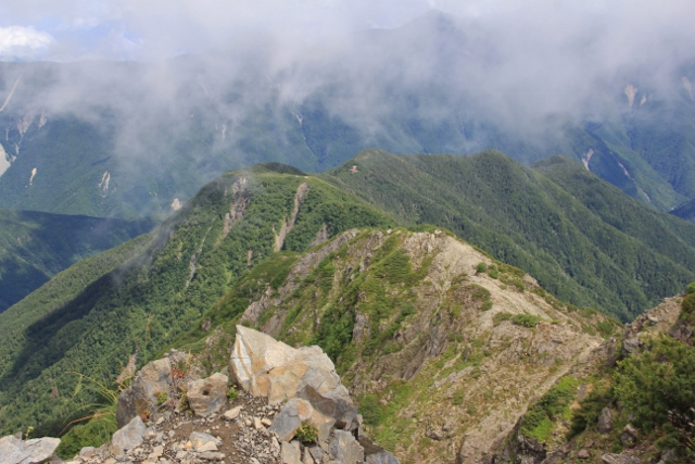 小赤石岳への苦しい登りの途中、今まで歩いてきた登山道を振り返る