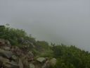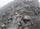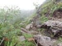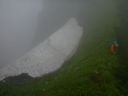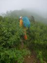 | 8月05日(水) 今日が核心である。標高差1800mの薮山、そして岩場を急登し、岩稜を縦走して涸沢へ下る。03:30前に起きて、食堂で即席ラーメンとアルファ米の朝食を早々に済ませた。 ザックに荷物を詰めて玄関に出る。扉の外からYKリーダーが徒歩道から林道へ2人の若い男性が抜けていったと声がかかる。外は霧雨、気温は21℃、気圧は昨夜と同じで安定している。ヘッドライトを頼りに右俣林道を登る。前方にヘッドライトがちらついていた。白出沢奥穂高岳登山口を過ぎる頃から次第に明るくなる。工事飯場と重機を左に見ると樹林は白出沢で切れ、広い沢を貫く林道の上下で河川工事が行われているのが見えた。通行止め馬ゲートの間を通って林道を進んだが行きどまりで対岸に渡ることができない。ゲートに戻ってみると左脇(下流側)に登山者用の道が設けられていた。 白出沢を渡りきると徒歩道は石だらけの細い登山道に変わり、左折して再び樹林帯の薮に入っていた。情報では数分で蒲田富士取り付きがあるはずであった。右手(山側)にあるという目印テープを探して念のため10分も進んだ。道が右俣谷に向かって下がっているのに気が付いて引き返す。なんと白出沢左岸から1分位のところの右手(白出沢側)の大きなコメツガ(シラベ?モミ?)の脇に立つ細木に濡れた赤布がぶら下がっている。左手(山側)の笹薮には雨水跡と間違いそうな踏み跡があった。「この奥10m位のところに赤テープが結んである」とYKリーダーがいう。尾根取り付きに違いない。小休止した後、暗い樹林帯の薮に踏み込んだ。 標高1600mから急傾斜の広めの尾根が標高1700mまで続く。登りに強いYKリーダーはドンドン薮を漕いで行くが、TIは10歩進んでは5秒の休みを取らないと息が切れて登ることができない。緩斜面に入ると今度は踏み跡に被さる笹が高く太くなり邪魔をする。これまでのところ適当な間隔で目印テープがぶら下がって不安はない。情報にあった倒木もそれほど邪魔をしない。むしろ複数の目印テープが同じ標高で左右に離れて結ばれている場所がいくつかある。霧雨が流れる樹林でその先のテープを曇った眼鏡を通して探す努力が必要であった。さらに何回か踏み跡が切れて、先行するYKリーダーの掛け声に従って新たな踏み跡に移らねばならない。先行者の道迷いを思わせる跡がいくつもあった。我々はより高い個所へ進めばよいのだが濡れた笹の茎が足を滑らせ、息が切れ、足に疲労が貯まった。 標高1900mの辺りから薮に岩が現れて登るにつれ大きくなる。とうとう細尾根が岩場に変わり、シラベと薮が岩の転落を抑えているようになり、さらに100mも登るとシラベが細くなり、薮も低くなって岩が卓越した。 藪漕ぎが楽になるかと思っていたら再び背丈並の笹薮尾根に交代する。光や水分が多い土壌場所では茎を太く高く、不利な場所では細くて低い笹薮に代わるのだろうが嫌なものだ。 尾根の踏み跡には古いゴミがぽつぽつと落ちていた。しかし情報にあったテント場はどこなのだろうか、見つからなかった。急傾斜の笹薮で突然が右手から伸びていた笹に眼鏡を跳ね飛ばされた。落ち着いてスペア眼鏡を取り出してかけてみた。視界が変だ。右のレンズがない。レンズを止める螺子が外れてケースにレンズが残っていた。霧雨の中、左目だけでは飛んだ眼鏡を探せない。YKリーダーを呼んで探すのを手伝ってもらった。幸運にも少し下がった踏み跡に落ちた眼鏡を見つけることができた。藪漕ぎに備えて眼鏡紐を持参したのに侮って装着していなかったことを強く反省した。もちろんすぐに眼鏡紐を眼鏡につけたのは言うまでもない。 左右の針葉樹林にダケカンバが混じり、それも次第に灌木と薮に変わりハイマツが混じり始めた。ハイマツが優勢な尾根にでたが霧雨で前後左右(東西北南)の展望が全くない。標高2630mあたりで切り立った露岩の尾根が現れ、固定ロープが尾根の右上から岩場を巻き気味に敷設されていた。最初は1本、途中から材料も長さも風化の具合が違うロープが数本あった。全ての固定ロープの上端は細くて尖った岩にビレイしてある。 ロープ上端から後はハイマツを掴んでの登りだ。平坦な尾根末端(約2700m)に到着した。ここからは蒲田富士の「長い頂上」(新ハイキング)となる。南から流れる霧がチングルマの穂を濡らして趣あるが前後左右の展望はなく、穂高涸沢岳の姿を見たかったが霧カーテンで隠れていた。蒲田富士頂上を示す目印なり山名板なりを探しながら踏み跡を辿っていたら左手にぼんやりした小峰、右手に急降下する踏み跡が出てきた。YKリーダーが「ここは涸沢西尾根への下降点、細引きが必要になるかもと想定した斜面上に着いてしまった」という。残雪期にしか登られない山だから雪の下に山頂標を置く登山者があろうはずはない。一息入れつつ、斜面を底まで覗き込んだ。 急斜面の踏み跡は崩れやすい土石混じりだったがコルまでロープを出す必要はなかった。最初のコルは左手の谷斜面