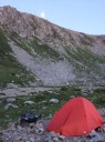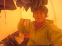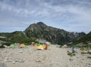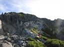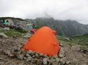 | 【コメント】 9月4日 扇沢で車中泊、夜中に雨も降って、天候はいまいちだ。だが室堂行きのチケット売り場にはすでに登山客が並んでいる。トロリーバス・ケーブルカー・ロープウェイ・トロリーバスを乗り継ぐ。朝1番のためかほとんどが登山客で平日のためか空いている。室堂からは一の越を目指し、雄山に向かう。ガスであまり視界はよくないが室堂にはまだまだ高山植物がたくさん咲いていて、道中を楽しませてくれる。 雄山までの登山道はガスがかかっており、岩だらけのルートを間違えないように登る。山頂には雄山神社の社務所があり一番高い山頂の神社でお祓いをしていただき、お神酒も頂く。次に大汝山を目指す。大汝小屋では「春を背負って」のロケをしたそうだ。このあたりから風とともに雨が強くなってくる。カッパを着込んで立山三山最後の富士の折立を目指す。天気も悪くなってきたせいか、ここまで来ると登山客はほとんどいない。岩に囲まれた富士の折立からは別山に向かう尾根筋が一望できる。途中、だんだん風雨が強くなり、真砂岳を通過してひたすらキャンプ場まで下っていく。 ガスの中、うっすらとキャンプ場が見えたときは、これで重い荷物を下ろせるのだと思い、とても嬉しかった。 受付を済ませてテントを張るが風が強く大変だった。石が多くてペグが曲がり、ペグはあきらめて石を利用してテントを張った。 とりあえずテントに落ち着くが明日の天気はどうなるか気が気でない。天気予報を何回も確認するが、何度見ても雨の予報。 5日に剣岳に登る予定だったが、これは無理かもしれないと思う。となると天候の回復を待つしかない。 幸い6日まで休みなので、時間は1日伸びても大丈夫。急遽予定変更を考える。 が、食糧とガスが足りないかも。・・・ガスで濡れた物を乾かさなくてはならないし。軽量化のため、ガスもハンパなのを持ってきてしまったのだ。なんて馬鹿な私。・・・ テントの中で食糧を広げて1日分延長の算段をする。仕方ない、最悪、剣沢小屋があるから何とかなるだろうと小屋まで向かう。剣沢小屋は10分くらい登山道を下ったところにある。小屋でガスが売っていることを祈ったが無いと言われた。ところが小屋のご主人が「これ使っていいよ」と、ガスを貸してくださった。雨で1日待機するかもしれないことを伝えると「雨降っても剣は登れないことはないけど、天気予報は変わるし、今年は天気が変わりやすくて合間に結構登れることが多いから準備だけは怠らないようにとアドバイスを頂いた。本当に感謝です。助かりました。テントに帰って、濡れた物を乾かし、明日に備えた。 夜間、雨風がますます強くなり、内側からテントを押さえることも数回あった。フライがバタバタして飛ぶんじゃないかと心配した。 天気の概況では寒冷前線が近畿地方を通過中ということだ。やはり明日は無理か。 9月5日 3時。早朝からテントに打ち付ける雨の音が激しい。真横から雨が打ち付けている。 フライの隙間から周りのテントを見てもどこも動きはなさそう。山もガスってて何も見えない。 9時頃まで、待機するが雨風は止まない。時折雨が弱くなった隙に急いでトイレに行ったり、テントの張り綱を石で補強したり、テントの周りに石を積む。一時的に雨足が弱くなっても又すぐ激しく降ってくる。 今日は間違いなく待機だ。食糧もなるべく節約することにした。 待機と決まったら、やることがない。スマホで暇をつぶしたいがバッテリーも貴重だ。2回分のバッテリーは持って来ているが貴重な情報源のため無駄使いしないようにする。本も重いので車に置いてきてしまった。チョコレートを数個食べてお昼にしたが、空腹感はなくならない。 雨がひどくてテントから出られない。1日中テントの中でのみ過ごすのは実に辛いものだと実感した。 テントの下を雨が小川のように流れたが、テントにしみることもなく、時折テントの内側下部を拭く程度ですんだ。もし、天候が回復しなければあきらめて明日帰らなくてはならない。 不安な気持ちで、1日数回ガスで湿気ったものを乾かしたり、天気予報を見たりを繰り返す。 やっと15時半ころから雨が小降りになってきて、周りのテントの人も外に出始めた。 初めて前剣とその向こうの剣岳が姿を見せ始め、周りの人達から歓声がわく。雲が切れて青空も見え始めた。やっと天候が回復してきたのだ。 9月6日 3時起床。満天の星空。絶好の登山日和になった。 4時にヘッドランプの灯を頼りに、キャンプ場を出発。すぐに剣沢の雪渓を渡らなくてはならないが朝早いため凍っていてツルツル滑る。四つん這いに近い姿勢でどうにか渡り、剣山荘まで向かう。遠く剣岳を見ると上の方にライトが動いている。 途中の鎖場を越え一服剣まで行くとだんだん空が明るくなってきて、ヘッドランプなしでも歩けるようになった。 登ったり、下ったり何箇所も鎖場を越えて浮石に注意して前剣を目指す。朝早いせいか