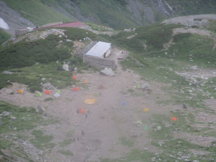 ガスの切れ目から剣沢キャンプ場が見えました