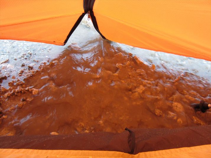 雨激しく、テントの下が川になっている
