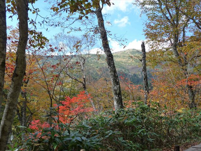 紅葉の向こうに小至仏山が見えます