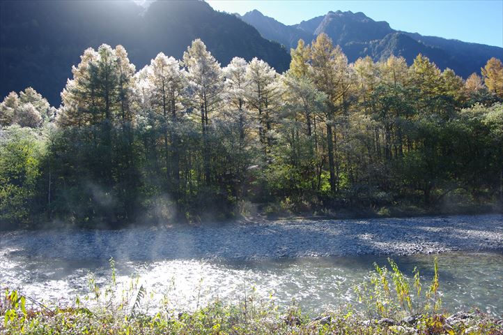 川霧たつ梓川と朝日に映える霧氷に輝く唐松林