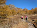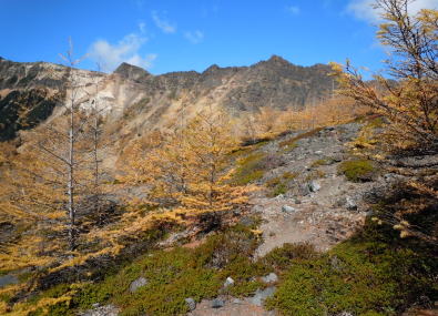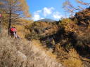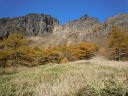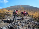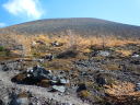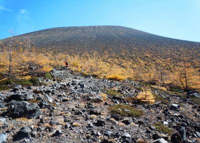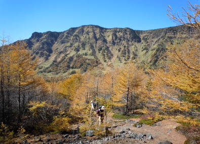 | 【山行記録】 記録:I/K 「火山活動は静穏・レベル1・前掛山登山は可能」という情報を得て、紅葉が見頃なこの季節、前掛山を登ってきた。 浅間山を取り巻く火山活動監視体制はとてもしっかりしていると聞いてはいるが、今回の御嶽山噴火の事もあり、より慎重になっていくのではないかと思う。 途中にある火山館に立ち寄ってみた。 小諸市の職員さんが年間を通じ、常駐して監視していると伺った。 「私が此処にいるときは大丈夫だ」と話していた。 自然保護にも力を入れているそうだ。 トイレも大幅に新設していた。 今日は穏やかな秋晴れ。 浅間山荘前の有料駐車場に着いたのは朝8:15分、すでに満車状態に近かった。 一面黄金色に輝く浅間山と黄葉のカラマツ紅葉は最盛期で、実に素晴らしかった。 地元の登山客によると、「山頂にガスも無く、風もなく、群馬側から長野側まで展望が望めるような日曜日は何度もない、今日は最高の日だ」と言っていた。 車坂峠から黒班山を登り、Jバンドから前掛山に。下りは湯ノ平口分岐から草すべりを経てトーミの頭に戻るコースも考えたが、日照時間の短い10月では無理と判断し浅間山荘コースを選択したが、その分、ゆっくり堪能できて最高だった。 遠くの主なる山々、槍ヶ岳や白馬岳などが見え、少し手前には噴煙立ちあがる御嶽山も見えた。安全を祈ってだろうか、火口近くで山伏の人が、「ボー、ボー」とホラ貝を吹いていた。浅間山に神聖な音色が鳴り響いていた。 |