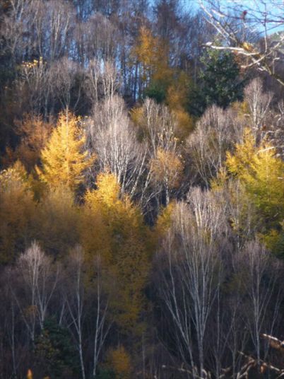 カラマツの黄色とシラカバの白が