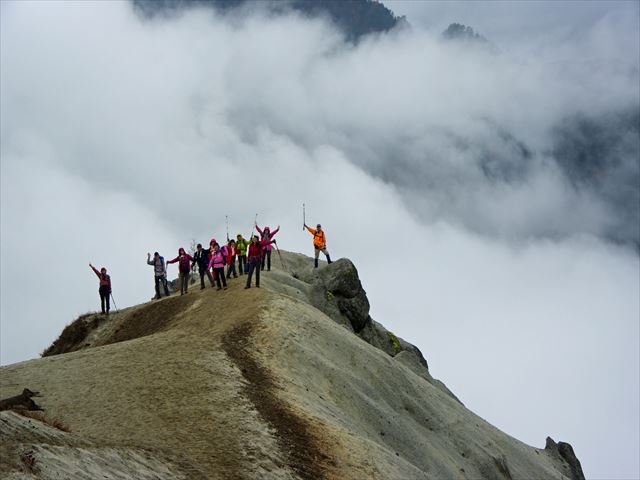 湧き立つ雲の背景に花崗岩砂の雁ヶ原の先で元気集合・雀躍!!