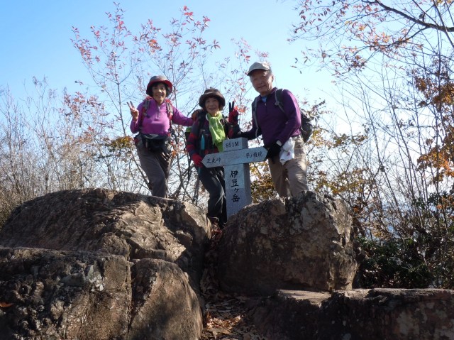伊豆ヶ岳山頂(851m)の新しい標識の前でパチリ!