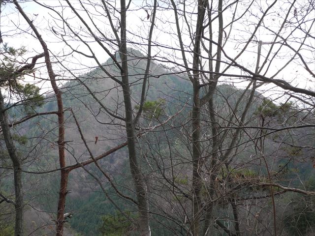 冬枯れの梢の間から倉岳山を振り返る