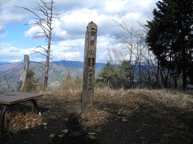 倉岳山頂上標、後には扇山・権現山・雨降山が望めます。