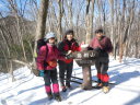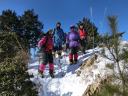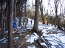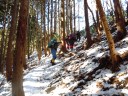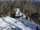 | 《山行記録》 前々日平野部にも雪が降り、新座でも5~6cm程の積雪になり、その後雨になりました。 低山も雪が多かろうと期待して蕨山山行に参加しました。 飯能から名郷までバスに乗り、蕨入林道から登山口へ。案の定、最初から雪道ですが、トレースはしっかり着いています。急登の連続で、雑木林の登山道からやがて岩尾根となり、晴天なのですが、北風が強く寒くて鼻水をすすりながらの登行、途中でアイゼンを装着。やはり足元が安定します。 ほぼコースタイムどおりに2時間半で蕨山山頂に到着。このコースは短いけれど急登の連続です。風を除けて少し下った見晴台で待望のランチです。リーダーご夫妻が用意して下さった玉子入り特製ラーメンのアツアツを美味しく頂きました。こんなに寒い日は暖かいものが嬉しい! ここからは金比羅尾根を下山。ゆったりした道を左右に奥武蔵の双子山、伊豆ヶ岳、武川岳、棒ノ嶺、三ツドッケ?等を望みながら、なだらかな雪の尾根道を行きます。 途中「さわらびの湯」の看板があり、800円と入浴料金まで書いてあるので笑ってしまいました。 藤棚山のピークを越え、金比羅山を巻いて、焼失して祠だけが残る金比羅神社跡からは一投足でさわらびの湯です。ほっこり暖まって帰路に着きました。 先週行った赤城山は穏やかな晴天に恵まれ、気候的に冬山の感じではなく、以外にも1033mの蕨山の方が厳しい冬山を体感した山行でした。 TK記 |