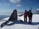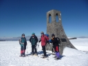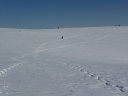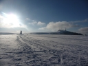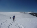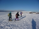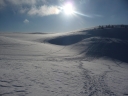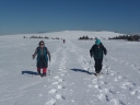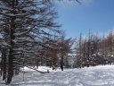 | 期日 2015年 2月 3〜4日(火水) メンバー L:M/U R/K R/S M/K T/K コースタイム 3日 山本小屋12:45―美しの塔13:00―13:50王ヶ頭14:15―山本小屋16:20 4日 山本小屋8:45―ゲート10:00―茶臼山10:30―山本小屋12:00 コメント キスゲの咲く美ヶ原は訪れた事はあるが、雪の美ヶ原は初めてです。 これ以上ない好天気で風も無し、360度の大展望、 スノーシューも初体験、 ハギマシコの群れ、熱燗の地酒や雉鍋と食べきれない程のご馳走。 明日立春が満月という月が明るすぎて、 星座達は大きな星しか見えない 珍しい現象、等々、贅沢すぎの二日間でした。明日からの予報は雪とか。 R/S 一昨日、昨日の快晴が、今朝は大雪予報通りとなりました。 其の快晴の二日間を名前に恥じない、最高に美しい、 美ヶ原に遊んできました。 360度の展望は富士山や御嶽山の噴煙が見え続く全ての山並みは白く輝き 見飽きることなく時間が 過ぎてしまった様です。特に蓼科山を始め八ヶ岳は 近くに見え印象に残りました。 T/K 冬の美ヶ原に行ってきました。美ヶ原の麓から山本小屋のご主人の車で 1995Mの山上に着くと一面の雪の原がとてもきれいだった。 天気良く風もなく、 山本小屋で、スノーシューとストックを借りて、私達は美しの塔から王ヶ頭まで 3時間ぐらい往復歩きました。 風もなく雲ひとつない青空が広がり暖かく、回りは北アルプスの白い峰々が連なり 煙を上げている御嶽山が、富士山、八ヶ岳、 目の前に大きく蓼科山と、二日間 すばらしい眺めでした。 あたたまる温泉もあり、食事もいっぱいでおいしく、 それから「ハギマシコ」という 小鳥が50羽ぐらい小屋のすぐ窓の外、白い雪の山の上に群れをなして飛んできて、 小屋の人が上げる餌をついばんでおりいつまでも見あきない光景でした。 M/K