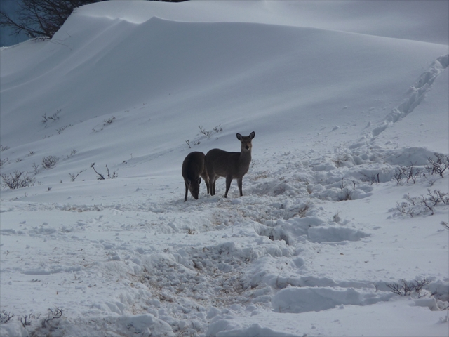 鹿の親子が雪を分けて草を食んでいました