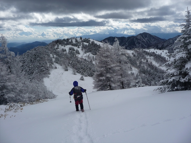 だあれもいない、ふかふかの新雪の斜面を石丸峠へと下ります
