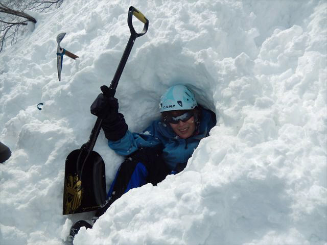 縦に掘った雪洞に入る