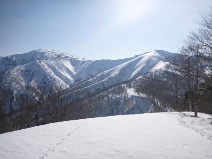 28三ツ岩岳と窓明山、下って来た斜面に踏み跡が筋に