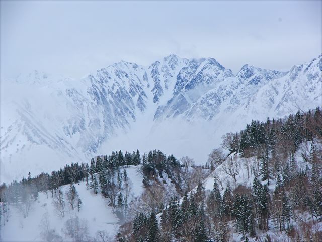 雪空に現れた唐松・天狗ノ頭・鑓ケ岳