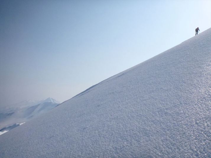 15急斜面を登る、向こうは羅臼岳