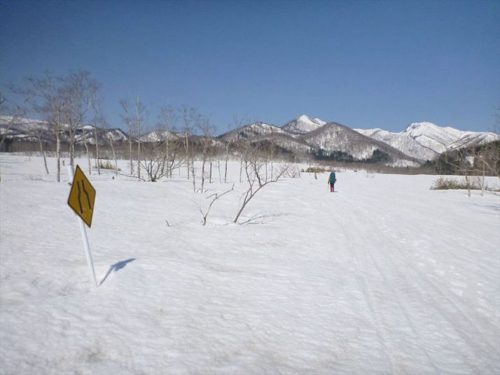 30町道の周囲は広い雪原、スノーモビルの轍跡が何筋も