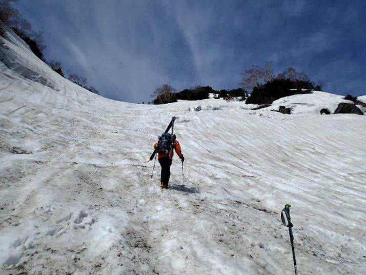 斜面が急なのでスキーを担いでのアイゼン登行です