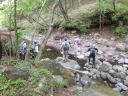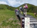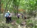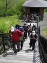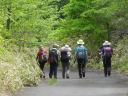 【 期 日 】 2015年5月23日(土) 【 メンバー 】 CL:MI SL:JI SN TK TM YS TM SN SW IK NM HA TK SA ST KY ST MI HY ES (以上20名) 【コースタイム】 東武日光発バス8:50=霧降高原レストハウス前9:15 霧降レストハウス前発9:30〜丸山10:30 〜40八平ヶ原11:10 〜レストハウス(昼食)11:50〜12:25つつじヶ丘分岐12:55〜合柄橋13:05 〜大山13:45〜55〜車道に出る 〜猫平14:35〜玉簾の滝15:10〜つつじヶ丘15:45〜霧降の滝BS15:50=バス15:58発 【 コ メ ン ト 】 初夏の好天の中、満員のバスは霧降高原に到着。涼しい高原の風がそよぐ。が、昔スキー場のリフトがあった所に 天空の階段が一直線に空に向かって延びている。凄い! 1段目には「START! 1段/1445段」の文字が!所々に迂 回路があるが、この階段を登りきって山道を少し行くと丸山に到着。汗をかいた。白ヤシオツツジが咲き残っている。広 々とした笹原の八平ヶ原を過ぎ、きれいなレストハウスで昼食。トイレもあり冷水を水筒に満たす。お腹も満たし樹林帯 の中を行く。春蝉が姦しく、カッコウの声がのどかだ。新緑にレンゲツツジと山ツツジの紅が映えて本当に美しい! 合柄 橋(ガッガラ橋)の標識で沢を渡り、牧場内を歩いて緩やかな登りで大山に着く。 赤薙山〜女峰山〜男体山の日光連山 の眺めが良い。 下りは笹の中の道や石ゴロの急下りもあり、車道に出て猫平の東屋からつつじヶ丘までが長く感じた。 途中隠れ三滝のうち、玉簾の滝が見られたのが良かった。マックラ滝も見てみたかったな〜。 天候に恵まれ、新緑の 中赤いツツジが美しく、ポイントごとに休憩の東屋があり霧降高原の美しさを味わった1日でした。 (TK記) |