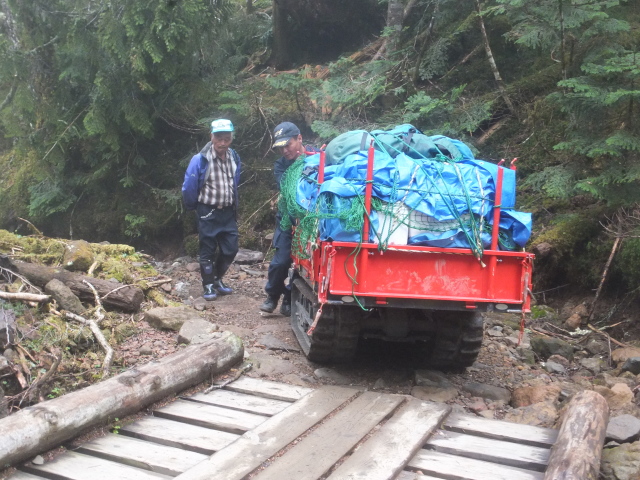 (オーレン小屋客100人分の食料と日本酒などを運ぶ車に遭遇しました!)