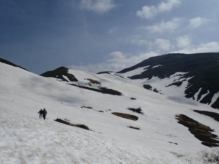 出発点からの左上方面が姥ヶ岳〜牛首〜月山山頂です