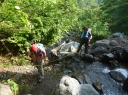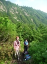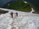 | 【期日】 2015年6月15日 【メンバー】 L:M/U Y/I E/S 【コースタイム】 赤倉沢登山口7:00−三吉ミチギ8:00−叶ノ高手9:50−11:50会津朝日岳12:40−人見ノ松14:30−登山口16:00 【コメント】 赤倉沢登山口駐車場には車が3台あった。 7時登山開始。真新しい木の橋を渡る。ここ数年土砂崩れで登山できなかったが、昨日開山祭があった。 道は良く整備されている。三吉ミチギまで2〜3回川を渡り、途中ニリンソウ、カタクリ、ラショウモンカズラなどを愛で る。 ブナの森の中の急坂を登り、人見ノ松に着くとピンク色のガクウラジロヨウラクが出迎えてくれた。 少し行くと初めてヒメサユリを見つけた。嬉しかった。今年は開花時期が早いようだ。 叶ノ高手で巨木のクロベ(ヒノキ科)を見て熊ノ平に向け下る。 熊ノ平には残雪があり、イワウチワ、イワカガミ、ショウジョウバカマが咲いていた。 熊ノ平避難小屋は立派だが、ドアが渋くて開けずらい。 バイウチノ高手で会津朝日岳がよく見える。 小幽沢カッチ辺りはタムシバがびっしり花を付けていた。ウワミズ桜も花が咲いていた。 ここから雪渓を100M位登り頂稜の一角に着くと岩場にツガザクラが一叢咲いている。隣にはアカモノも。 山頂は右手の方にある。 頂上からは少し霞んだ田子倉湖、浅草岳、越後駒、平ヶ岳、会津駒ケ岳方面を臨みまったり楽しんだ。 帰りは軽アイゼンを着け慎重に下った。結構長い山行だった。 E/S記 |