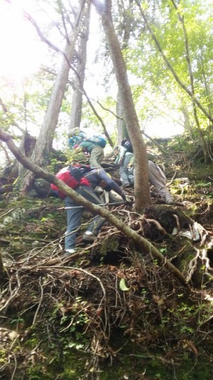 木の根・岩角が出た道を歩きます