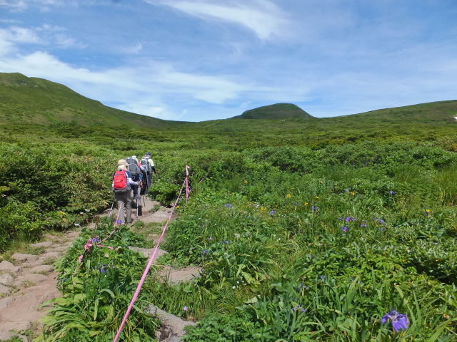 お花畑が広がる。目の前が焼石岳。左は横岳