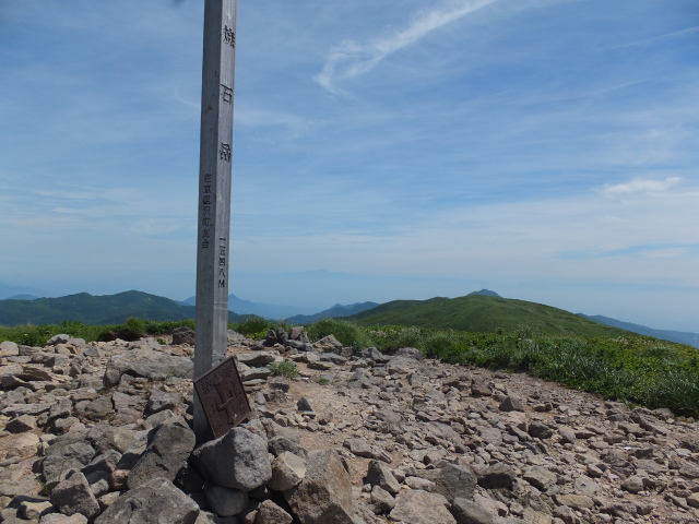 焼石岳に到着。北東方面に早池峰山(中央)が薄っすら見えます