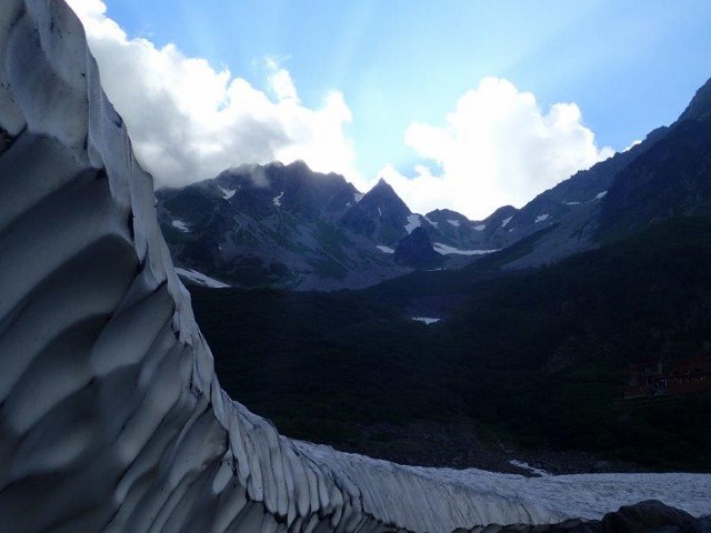 涸沢岳と涸沢槍、絵になる形で雪が残っていました