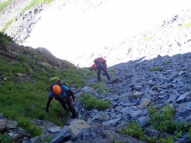 北穂東稜へ向け危ないガレ沢を登ります