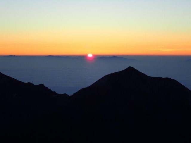 北穂小屋での日の出、山は常念岳、(4時50分)