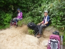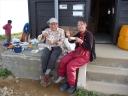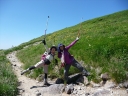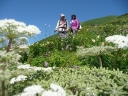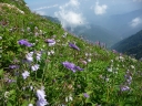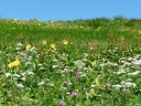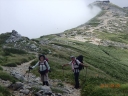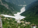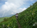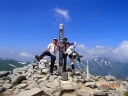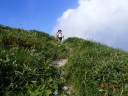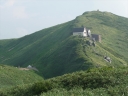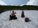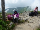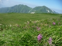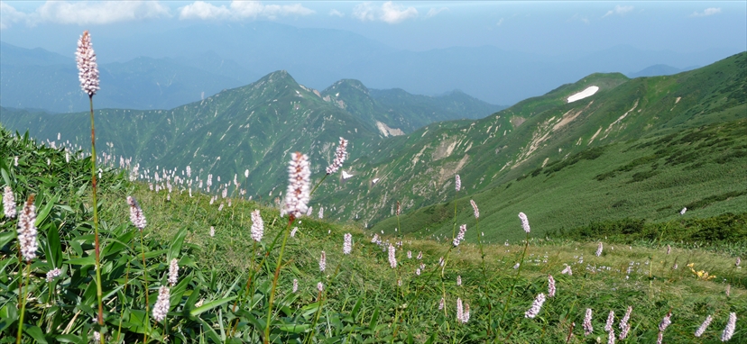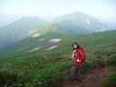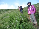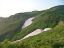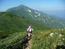 【コメント】 花、はな、ハナでお花畑は溢れかえっていました。天候も良く、青空と小屋がかわいらしくマッチし、ヨーロッパアルプスの雰囲気を漂わせている、そんな飯豊連峰を縦走してきました。 1日目は前日まで考えあぐねた石転び沢の雪渓登りを諦め、飯豊山荘〜梶川峰を登りました。 小屋番さんも優しく親切でした。冷たいギンギンに冷やされたビールを1本飲む。 2日目は門内小屋を出発し、ラクラク5時間到着地点の予定を立てました。花を見て、写真を取り、三歩歩いては止まりの繰り返し。梅花皮小屋に着くと、小屋番さんが展望石から石転び沢をウオッチングしていました。 3日目 大日岳に朝一番で登る。から身なのですいすい登れてしまう。大日岳〜西大日岳がよく見えた。いつかあの道も歩きたいと思った。のんびり過ごし、御西小屋に戻る。そこで本日の朝食をいただく。御西小屋を後にし、駒形山に行く。道がず〜っと花街道!!どこまでも、どこまでも、どこまでも、どこどこまでも花街道!!余りの花の多さに初期の感動は薄れマヒしてくる。何と贅沢な事だろう。飯豊山に着き、本山小屋を過ぎると隠れた水場があった。冷たく手が切れるような水で顔を洗う。ここから切合小屋まで何か所か雪田?雪渓が残っており、暑いのでそこで休憩を兼ね雪遊びをする。切合小屋に到着すると、そこは超満員!!二階の部屋は暑苦しい。夕食はカレーおかわり自由。おかわりに行くと、「何回でも来なさい」と小屋番さんは優しい。全員爆睡!! 4日目 朝は外のベンチで食事。地蔵岳までが暑くて参った。地蔵岳に着くと、ツアー団体が休んでいた。私達は、ツアーをさけ、少し下で休憩を取る。ここから900m超を一気に下っていく。今日の頑張りどころだ、と気合を入れたが終わってみると気合を入れるほどの下りではなかった。ザンゲ坂は、ザンゲすることのない私達ゆえに簡単だったのか? |