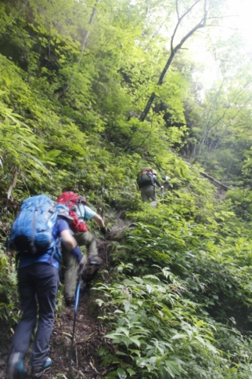 段差の大きな沢沿いの登山道