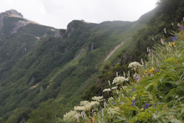 お花畑の先に燕岳山頂 まだまだ登りが続く