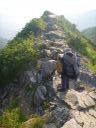 | 樹林帯に入る。休んでいたら今度は年配男性が登ってきた。やはり・・・ P1499mの西巻道を北にとる。霧が流れてきて空を覆う。巻いた後は峰まで岩壁を岩角や木の根を掴んで登る、上から男性が下ってきた。やはり・・・ 肩に出てピークでひと休みした。もちろんQさんは先行してTIを待っている。コルに下ってP1368mに登り返し、また下って岩峰に取り付く。岩壁の脇に登山路があり迷うことはない。岩峰に登ると.下って来た尾根筋を振り返ることができる。 | ||||||||||