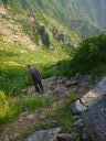 | 寝場所を確保できたので水補給に水場に向かう。水場分岐について右手に張ったテントを見て管理人が言っていた「本山神社の境内」とはこのテント場と納得した。なりほど屯していた人がいたわけだ。 分岐から下って水場で水を4L補給した。水量は十分、水場はずいぶん前に残雪から顔を出していたのではと思える状況であった。飯豊山行を楽しんでいるご夫婦も下ってきてQさんと情報交換している。ヘリコプターが上空に爆音を轟かせて舞う。水場から登り返して改め飯豊神社に参拝して本山小屋に帰った |