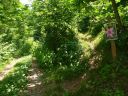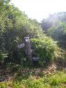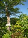 | 尾根分岐を北にとって次は西へ、こぶ山(1121m)で一休みして魔法瓶の冷水を飲んだ。美味しい、風も涼しい。今日はたっぷりの水がある。ミズナラの大木に目を見張り、さらに水場で補給したたっぷりの水を飲み、更に補給して下る。 ここまではルンルンであったが大日杉前の簡易吊橋には驚いた。まず梯子から吊橋に登るには大ザックが邪魔、先行するQさんの動作を参考に吊橋に登って、足幅一本の踏み板にのった。錆びた針金を掴み、橋を揺らさないようにを渡る。短くてよかった。もっと長くて目がくらむ恐ろしい吊橋を南ア深南部で渡ったのはいつだったか。歳をとったな |
