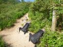 | 横峰分岐にザックを置いて水場に向かう。10分ほど下って水場に到着した。冷たい水がたっぷり流れている。一飲み、喉を癒した後、全ての容器に水を満たしてヤマホトトギスの花を愛でながら水場分岐に戻った。 水場分岐に熊本から来た年配夫妻が休憩中であった。水場の前を通って横峰から車を停めてある川入に下るそうだ |