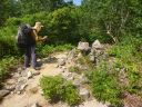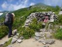 | 積み石で囲まれた姥権現前に着いた。姥様は不動尊のように怒り顔である。権現というからには神がこの世に現れた姿だろう。それならば熊野権現のように若い姿でもいいのではないか。こじつけを疑うがこんな問題は世間では無視されるのだろう。 岩砂の広い尾根には実をつけたタイツリオウギやオヤマソバが生えている。その向こうに飯豊本山の頂きがあった。御秘所の岩稜を登る。岩場の急傾斜に自分に掛け声をかけて手足を使う。標高点1892mを過ぎると目前に二王子の積み石が見える。周りには飯豊らしいくオヤマノリンドウやミヤマウスユキソウの群落がそこここにあってカメラ被写体を選ぶのに迷う。御前坂の道標が出て来た 御前坂の岩っぽいザレ電光道を登って、下ってくる集団が通り過ぎるのを待っていると、その集団の中から高年男性が突然TIの目の前に転がり落ちてきた。幸運にも石で頭を打つこともなく擦り傷程度で止まったが、本人は気が動転しているようであった。周りでは女性達がキーキーギャーギャーとひと騒ぎしている。若い男性ツアーガイドが本人に声を掛け、座らせて状況を確認していた。干渉してはならない。 御前坂を登りつめてふり返ると転落騒ぎを起こしたグループは止まることなく下っていた。良かった。左を見上げれば本山から尾西~大日岳への稜線にも人影が見える。足元の石の隙間にはイワツメクサが生えていた。 二王子の積石脇へ向かう。本山小屋は目前だ。水場分岐前には数人が休憩中であった |