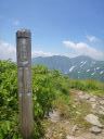 | 石祠に出会う。道標には御坪とある。調べれば由来縁起が分かるのだろうが手を合わせて通過した。P1590mに登り、尾根・谷分岐に出会う。我々は(何度もこの道を歩んだCLのQさんは)尾根道を選んだ。標高点1660mを越えるとハイマツが出る。縦走路はアップダウンのある岩稜に変わり、切合小屋を見通すことができた。 岩稜から笹斜面を巻く道に入り、種蒔山から下る沢に出会う。ニッコウキスゲの花の先に雪解け水が迸り、沢脇斜面を見上げるとナンキンコザサクラがピンクの花園を作っていた。目洗清水でしおれ花に大喜びしたのがウソのようであった。沢の上流で清冽な水を補給して沢の下流を見下ろすとまだ残雪が谷を埋めていた。大日杉小屋で同宿した4人が追いついて私たちとともに一休みした。草叢に空色のリンドウを見つけたが副片が立っていないのでミヤママリンドウ、ざんねんながらイイデリンドウではなかった。 草付の巻道を歩むと空色が目に入るがこれらもミヤママリンドウらしかった。残雪を回り込んで主稜線にでた。道標で現在位置を確認する。ヤマハハコの向こうにも雪渓が見える。白砂の尾根にケルンが立ち、タカネマツムシソウの群落が空に向かって開いていた |